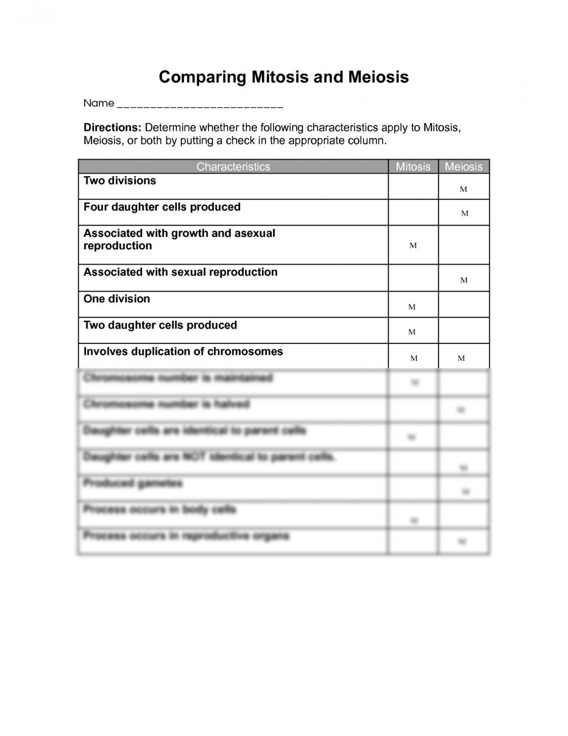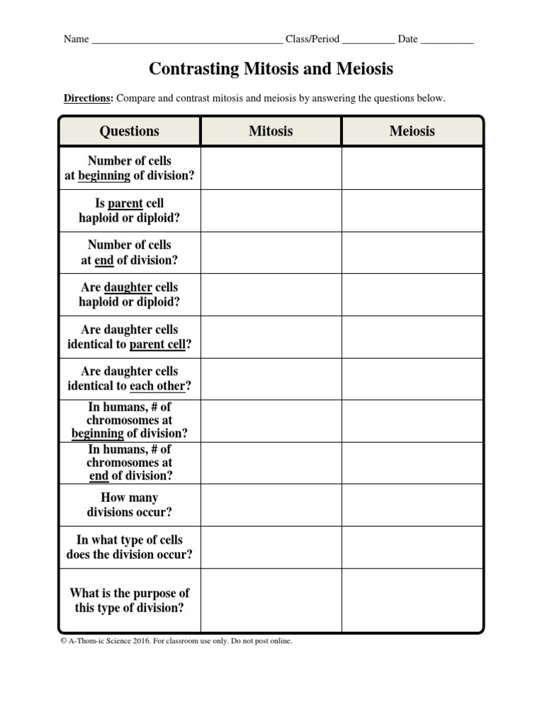 Worksheet Comparing Mitosis and Meiosis