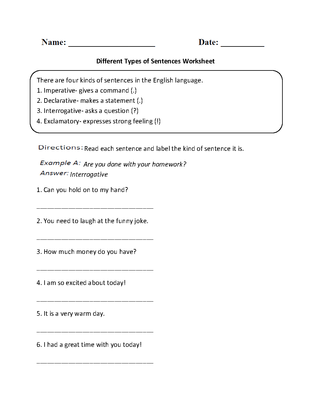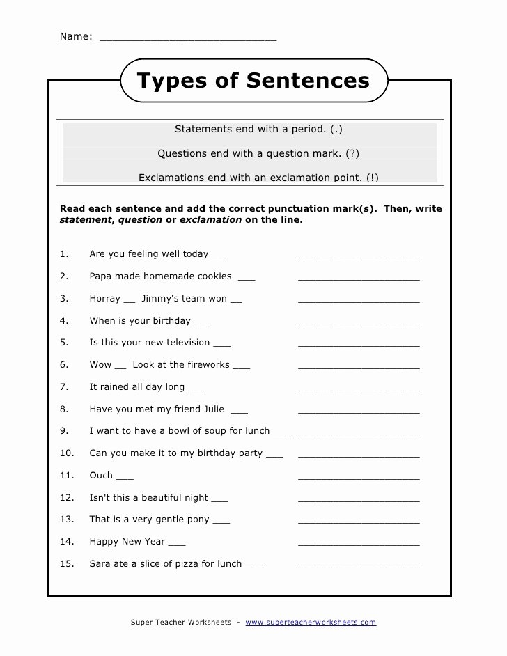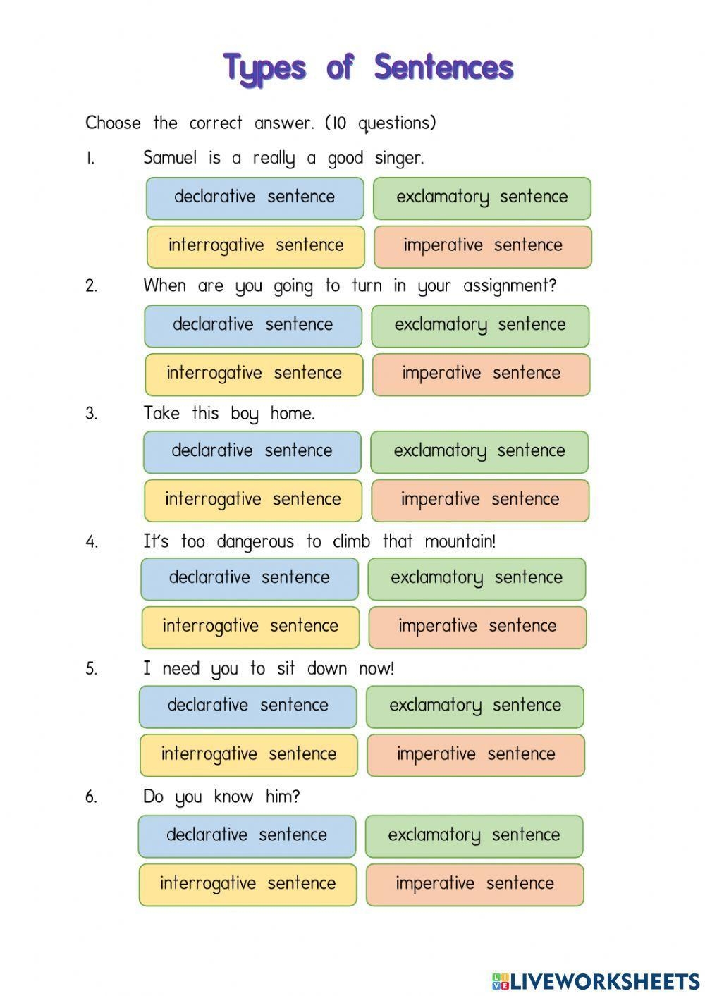 By practicing with this worksheet, students will gain a better understanding of the different types of sentences and how to use them effectively in their writing and communication.