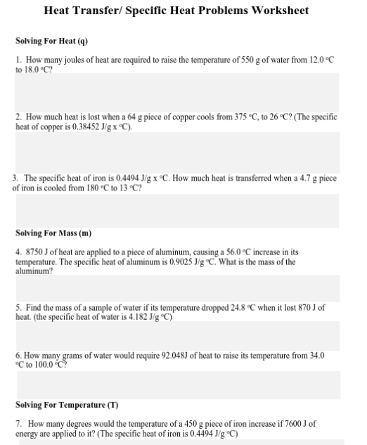 One way to practice and reinforce your understanding of specific heat is through worksheets. These worksheets typically contain a series of problems that require you to calculate specific heat using the formula Q = mcΔT, where Q is the heat energy transferred, m is the mass of the substance, c is the specific heat capacity, and ΔT is the change in temperature. By working through these problems, you can improve your skills in applying the specific heat formula and gain a deeper understanding of how it is used in real-world scenarios.