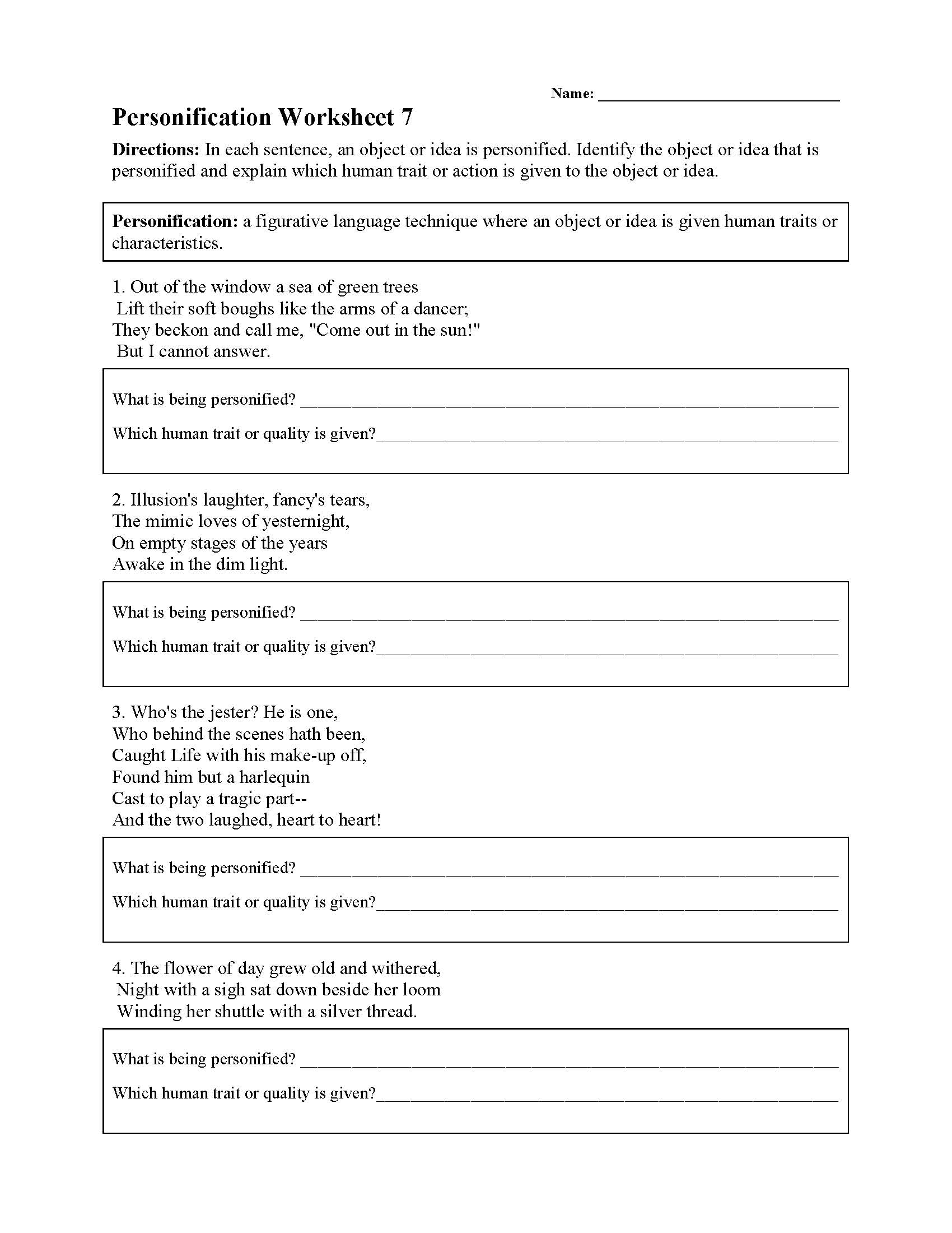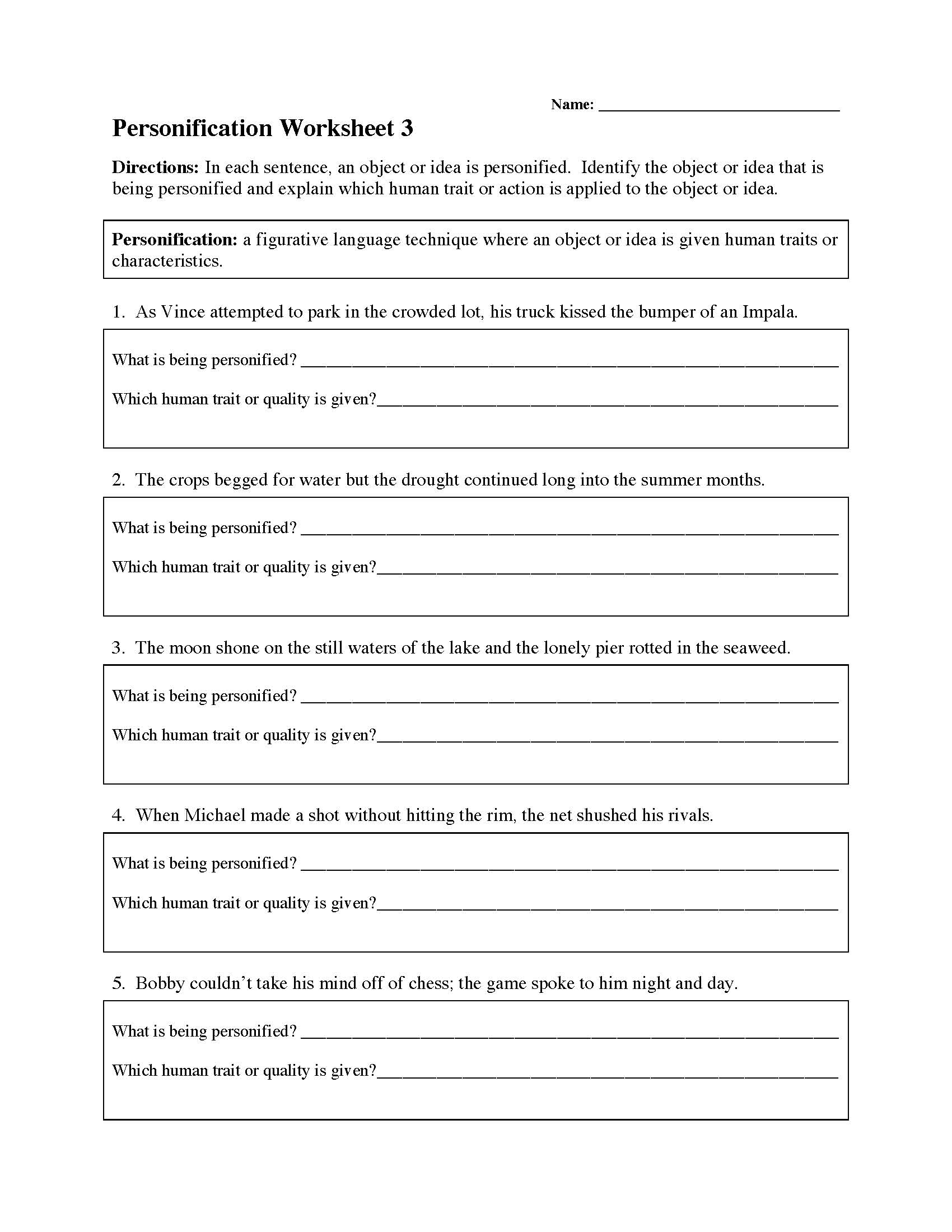 Worksheets for personification are a great way for students to practice identifying examples of personification in literature, as well as creating their own. These worksheets can include passages from poems, stories, or even everyday sentences where students have to identify the object being personified and the human quality it is given.