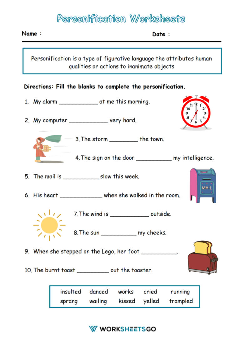 Another type of worksheet could involve students creating their own examples of personification. They could be given a list of objects and asked to write sentences giving them human qualities. This not only helps students understand the concept of personification, but also allows them to get creative with their writing.