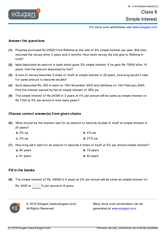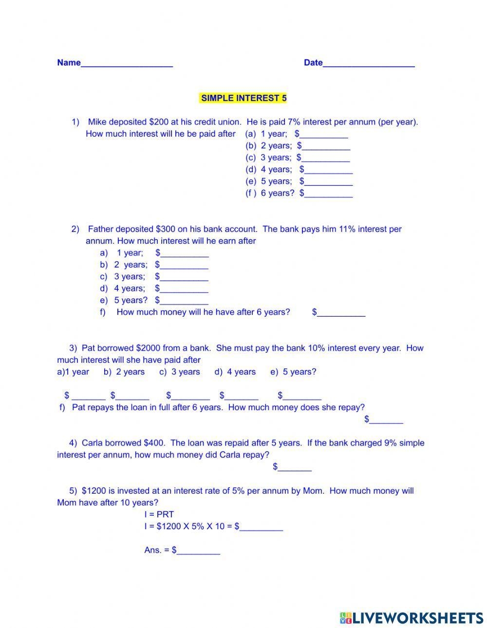 By practicing with worksheets for simple interest, students can improve their math skills and become more comfortable with calculating interest in various situations. These worksheets can also be a useful tool for teachers to assess their students’ understanding of the concept and provide targeted support where needed.