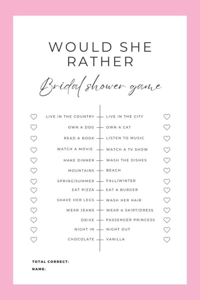So if you’re looking for a fun and interactive game to play at your bridal shower, look no further than the “Would They Rather” bridal shower game printable. It’s sure to be a hit with your guests and will create lasting memories for the bride-to-be.